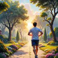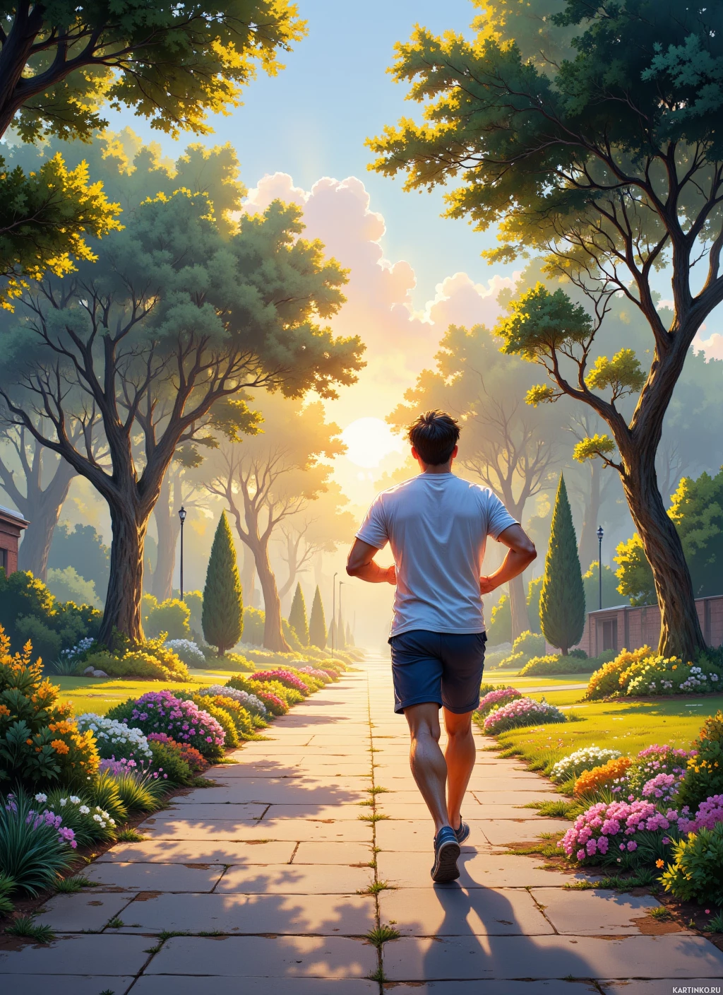 На картинке запечатлена умиротворяющая сцена: мужчина бежит по каменной дорожке, проходящей через пышный сад. На заднем плане восходит или заходит солнце, окутывая все вокруг теплым светом и подчёркивая лёгкую дымку в воздухе. Высокие деревья с густой листвой обрамляют дорожку, что говорит о том, что это может быть весна или лето. Мужчина, снятый со спины, одет в спортивную одежду и запечатлен в момент бега. Общая атмосфера картинки – спокойствие и безмятежность.