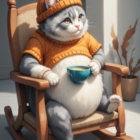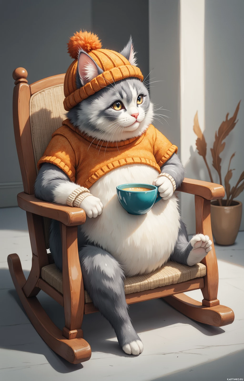 cat character sitting on a wooden rocking chair, wearing a small orange sweater with stripes on the front and a matching knit hat. The cat has long fur and appears to be quite content as it holds a blue