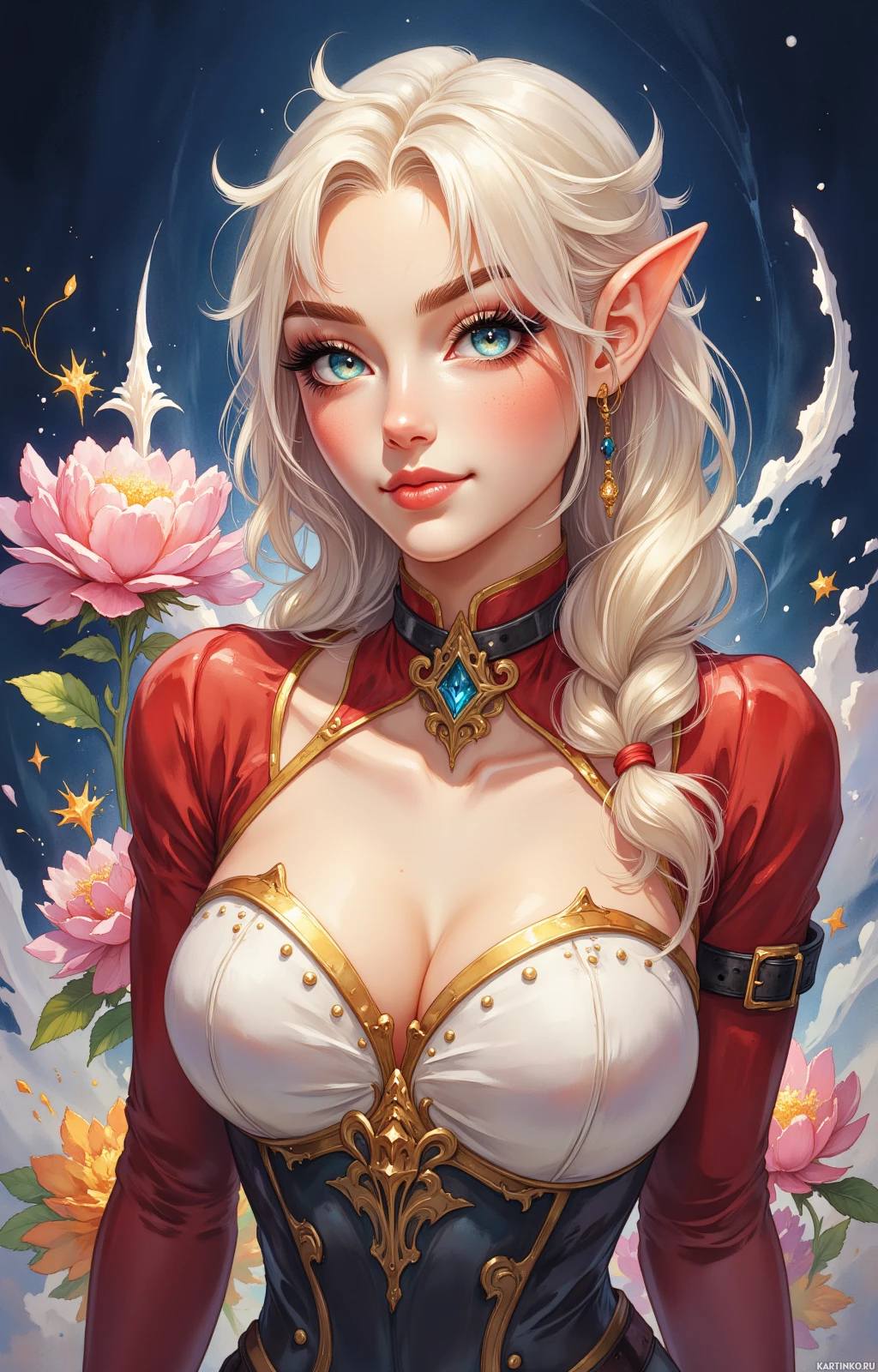 blonde hair styled with a side parting and red accents on the lips and around her eyes that give her a distinctive, fashionable appearance. She has pointed ears, which are common characteristics of elves in