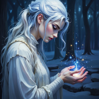 translucent dress that may suggest she's portraying an otherworldly or ethereal character. She holds what seems to be a magical potion in her right hand, which has been gently stirred, causing it to emit a soft,