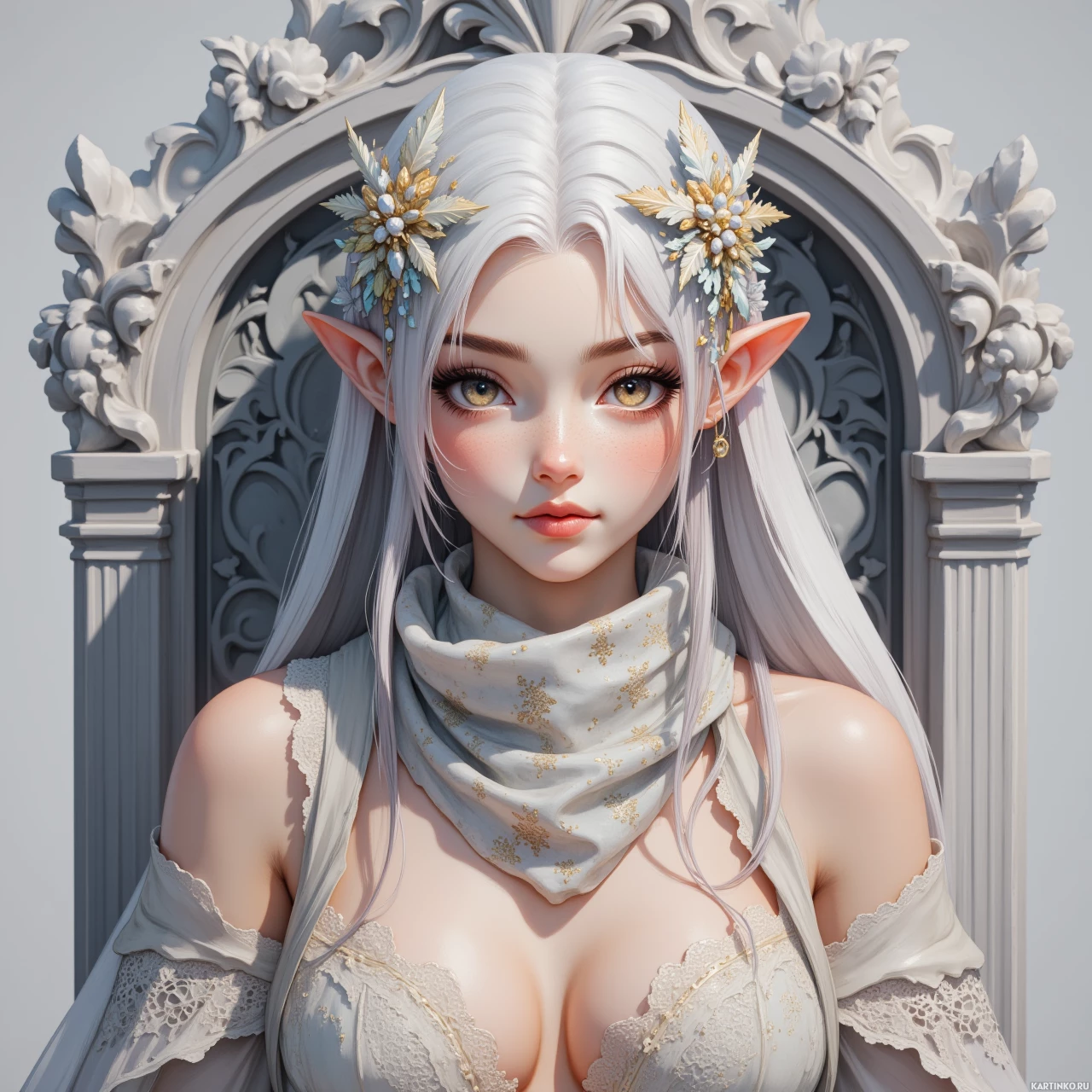 white hair, pointed ears resembling those of an elf, and is wearing intricate makeup that highlights her eyes, lips, and cheeks. Her expression is neutral, and she's looking directly at the viewer. She is adorned with what appears to be a crown or headband, possibly made of gold, which has small gems embedded into it, adding to her