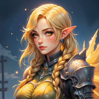 blonde hair styled in braids with a side swept fringe, and she appears to be wearing armor that suggests a warrior or knight role. The armor is predominantly green, with