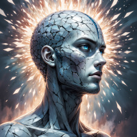 mechanical components, possibly serving as breathing apparatus or sensory inputs. Around the head, there are dynamic lines and shapes that give the impression of sparks or a burst of energy, which may represent thought processes, power sources, or simply be an artistic embellishment to enhance the futuristic theme. The background is abstract with swirling patterns that could be interpreted as cosmic elements or another form of energy. The overall impression is one of high technology and the intersection of organic life with advanced machinery, possibly in a conceptual or science fiction context.