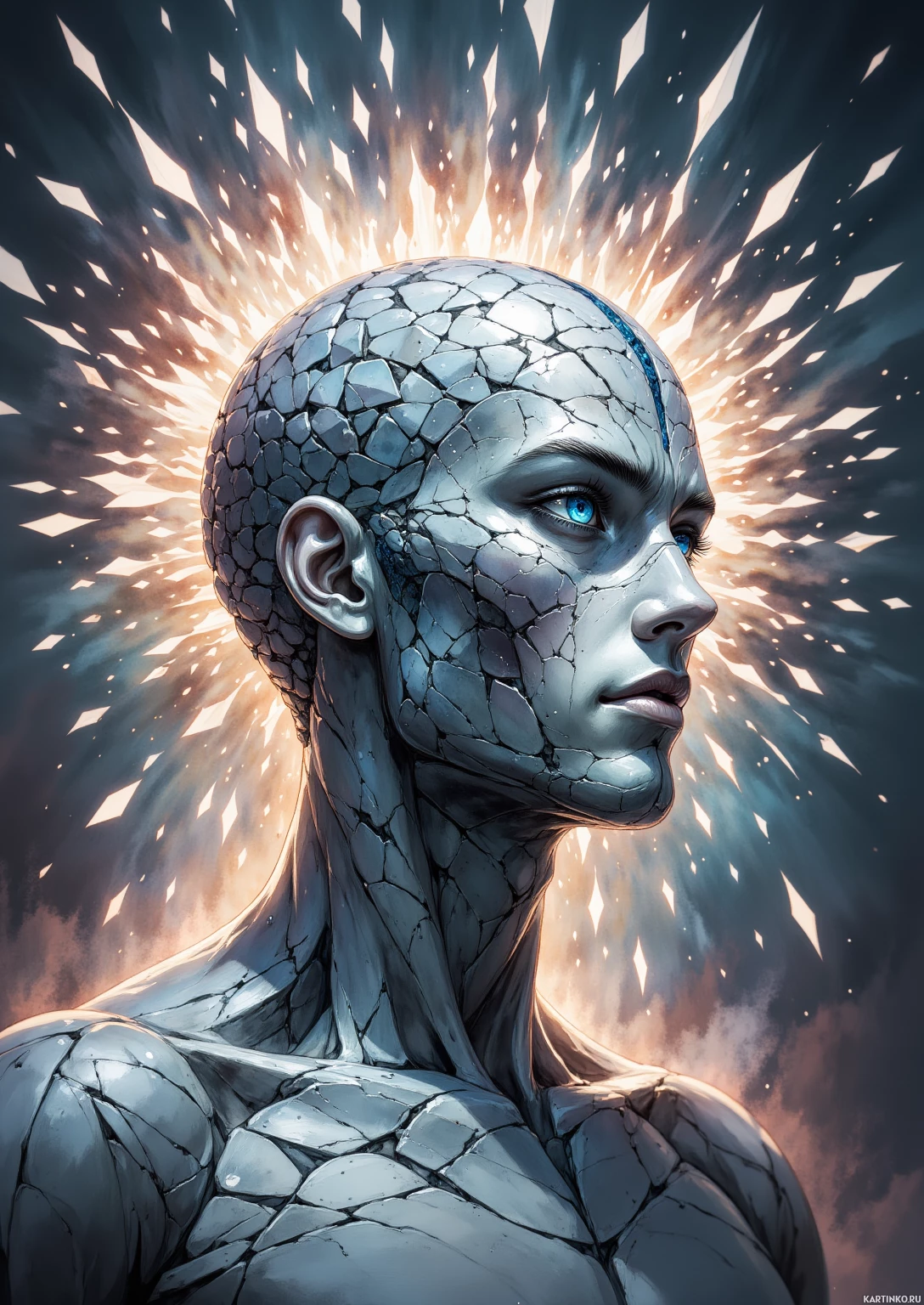 blue light, which could imply some form of energy emanation or consciousness enlightenment. The nose and mouth area is also detailed with