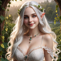 a forest setting, where green foliage and trees are visible in the background. The elf has striking