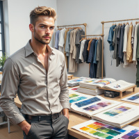 The image shows a man standing in what appears to be a clothing or fabric store. He is dressed in smart casual attire, consisting of a button-up shirt and trousers, with the shirt being unbuttoned at the top, revealing his chest. He has short hair and is looking directly at the camera with a neutral expression. Behind him, there are various items that suggest he might be in a clothing or fabric store. There are hanging garments on what seems to be a rack or display stand, showcasing different patterns and textures. On the left side, there is a table with books open to specific pages displaying color swatches, indicating that this place could be focused on choosing colors for clothing or design purposes. The man has his hands in his pockets and seems relaxed as he poses for the photograph. The overall atmosphere of the image suggests it might be used for promotional or lifestyle purposes, highlighting fashion or interior design aspects.