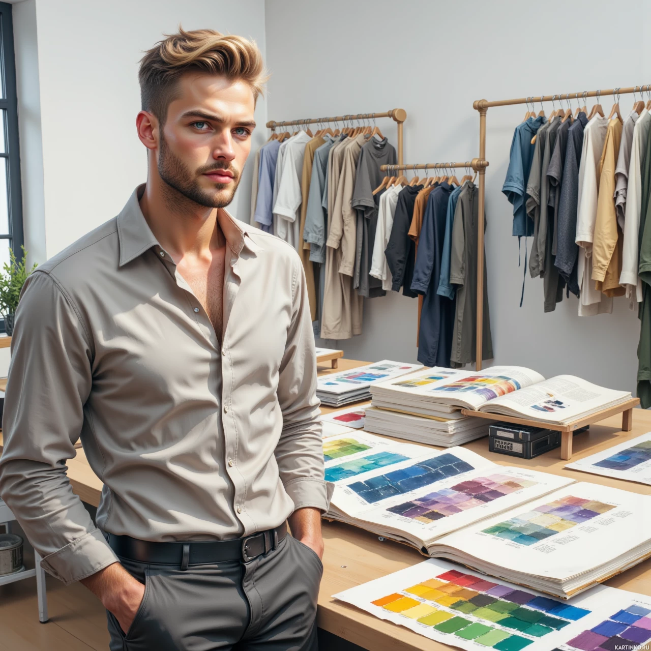 На картинке мужчина стоит в том, что похоже на магазин одежды или ткани. На нём стильная повседневная одежда: рубашка с расстегнутой верхней пуговицей, открывающей грудь, и брюки. У него короткая стрижка, и он смотрит прямо в камеру с нейтральным выражением лица. Позади него видны различные товары, что указывает на то, что он находится в магазине одежды или ткани. На видном месте развешены предметы одежды, демонстрирующие разные узоры и текстуры. Слева стоит стол с книгами, раскрытыми на страницах с образцами цветов, что говорит о том, что это место может быть посвящено подбору оттенков для одежды или дизайна. У мужчины руки в карманах, и он кажется расслабленным, позируя для фотографии. Общая атмосфера картинки предполагает, что она может быть использована для рекламных или lifestyle целей, подчеркивая моду или аспекты дизайна интерьера.