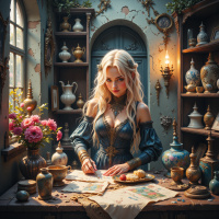 The image depicts a young woman with long blonde hair and fair skin. She is wearing historical-looking clothing, including a dark top that could be described as a bodice or corset, which suggests a fantasy or historical theme. Her expression is serious, and she is looking away from the viewer, downwards. The setting appears to be a room filled with various objects that suggest a mystical or magical theme. There are shelves filled with ornate vases and bottles, some of which resemble alchemical or apothecary items. A potion flask is visible among the items on the desk in front of her, along with what looks like a recipe book. Additional details include a bouquet of flowers that are out of focus to the right side, and a lamp on a desk next to the woman's elbow. The lighting casts an atmospheric glow, enhancing the mystical ambiance. Overall, the image evokes a sense of fantasy or historical storytelling, possibly hinting at a character in a fairy tale or a period drama with magical elements.