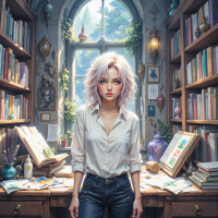 The image shows a young woman seated at a desk filled with books and various other objects that suggest an intellectual or creative setting. She is wearing a button-up shirt, trousers, and has her hair styled in a short, wavy manner. Her expression appears contemplative as she gazes off to the side. Behind her is a window with white curtains partially drawn aside, allowing a view of greenery outside. The room gives an impression of being a personal study or workspace, filled with books and decorative items such as vases and paintings on the wall behind her.