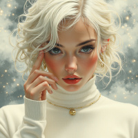 The image shows a woman with white hair. She has a makeup look that includes defined eyebrows and lipstick, and her eyes appear to be enhanced in a way that is common for digital art or portraits. The woman is wearing a high-necked, cream-colored turtleneck sweater and a pair of large hoop earrings with what looks like a gold charm at the bottom. There are small, subtle lights floating above her head that add to the ethereal quality of the image. The overall style of the image is realistic with a touch of surrealism in the light effects.