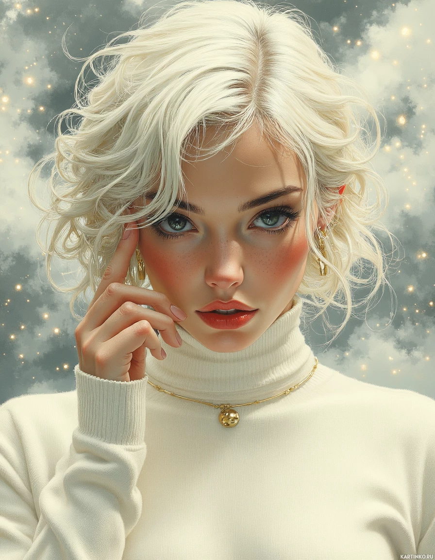 На картинке изображена женщина с белыми волосами. У неё макияж с чёткими бровями и помадой, а глаза выглядят так, как будто их слегка обработали – это характерно для цифрового искусства или портретов. На ней тёплый водолазка с высоким горлом и большие золотые серьги-кольца с подвеской. Над головой витают едва заметные огоньки, придающие картинке неземную атмосферу. Общий стиль изображения – реалистичный, с лёгким налетом сюрреализма в световых эффектах.
