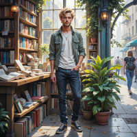 На картинке запечатлён молодой человек, стоящий, похоже, на открытой площадке, стилизованной под книжный магазин. Он одет неформально: светлая куртка поверх белой футболки и синие джинсы. Его поза говорит о том, что он позирует для фотографии, одна рука лежит на бедре, другая свободно свисает. Вокруг него стеллажи, заставленные книгами и растениями, добавляющими зелени в сцену. На полках можно увидеть разные названия книг, но разобрать их не удаётся. Освещение указывает на то, что это либо поздний вечер, либо ранняя вечерняя пора, судя по тёплому освещению. На заднем плане — городской пейзаж, прохожие и здания, частично виднеющиеся вдалеке. Ясное небо говорит о хорошей погоде. В целом, на картинке создана непринуждённая и расслабленная атмосфера, характерная для беззаботного дня, проведённого за покупками или рассматриванием книг в оживлённом городе.