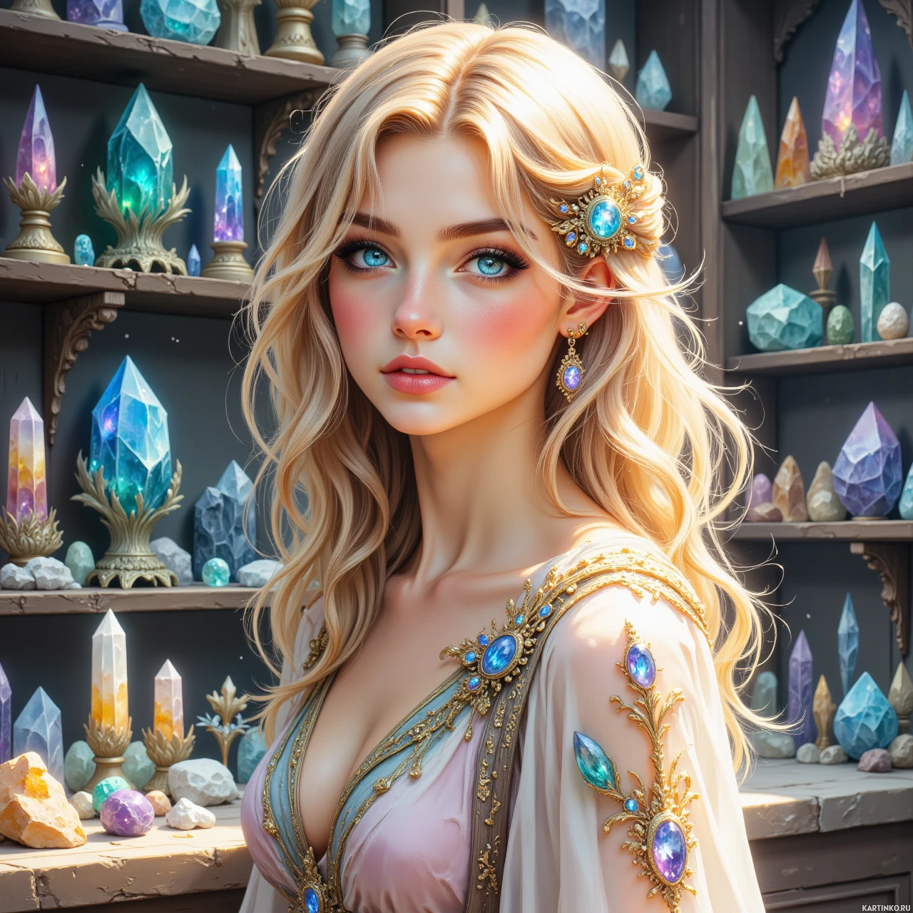 На картинке изображена девушка с длинными светлыми волосами и выразительными голубыми глазами. У нее изысканный вид, макияж подчеркивает черты лица: румяные щеки, чувственные губы и четкие брови. Выражение лица нейтральное, взгляд направлен в сторону. На ней детализированный костюм с украшениями, инкрустированными драгоценными камнями, и сложным узором на платье. Костюм вдохновлен фэнтези или исторической эпохой, что наводит на мысль о персонаже из мира высоких фэнтези или истории, действие которой происходит в прошлом. На заднем плане выставлена россыпь разноцветных кристаллов или драгоценных камней. Эти камни различной формы и размера, расположенные так, чтобы создать яркую и мистическую атмосферу. Освещение на картинке подчеркивает глянцевые поверхности кристаллов, добавляя волшебства. В целом, картинка передает ощущение волшебства и величия, а главная героиня словно готовится к аудиенции или церемонии, связанной с драгоценными камнями позади нее. Стиль картинки напоминает иллюстрации к фэнтезийным книгам, фильмам или видеоиграм, в которых есть элементы магии.