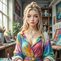 The image features a woman seated in an art studio. She has blonde hair styled into loose waves and is wearing makeup that accentuates her eyes. Her attire consists of a colorful top with what appears to be a paint splatter design, paired with dark pants. The setting is filled with various art supplies and materials. There are several paintings on easels or walls around the studio, each with unique styles and colors that contribute to an eclectic and creative atmosphere. On tables and surfaces around her are brushes, paints in different hues, palettes, and possibly other art tools. The lighting is soft and diffused, suggesting it might be natural or from a window not visible in the frame. The overall vibe of the image conveys an artistic and bohemian feel.