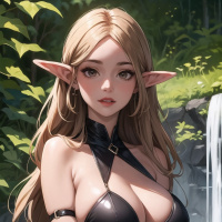 a small waterfall in the background, which adds to the fantasy theme of the artwork. The character's expression is neutral, and she is looking directly at the viewer.