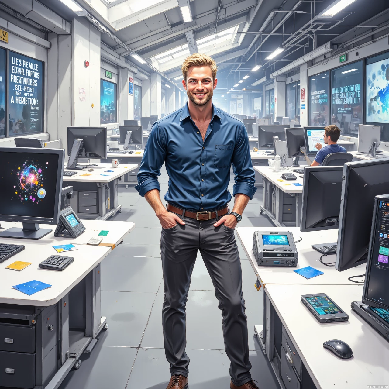 На картинке запечатлён мужчина, стоящий, по всей видимости, в офисе или технологической лаборатории. Он улыбается и смотрит прямо в камеру. На нём тёмно-синяя рубашка, серые брюки и коричневые туфли. Волосы короткие, лёгкая небритость. На заднем плане – несколько компьютерных мониторов на столах, что указывает на то, что это рабочее пространство, связанное с технологиями или вычислительной техникой. Разбросаны различные технические устройства, такие как ноутбуки и планшеты, что создаёт современную, высокотехнологичную атмосферу. Освещение искусственное, мягко освещает пространство, которое имеет индустриальный вид благодаря открытым потолочным элементам и бетонным стенам.