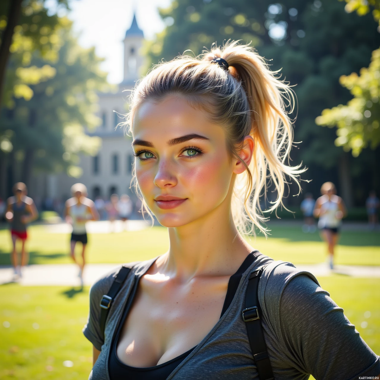 На картинке молодая женщина со светлыми, почти белыми волосами, заплетенными в косичку набок. У нее светлая кожа и спокойное выражение лица. Она одета в серую майку и рюкзак. Судя по яркому солнечному свету, действие происходит на улице, днем. На заднем плане видны люди, занимающиеся спортом, но они не в фокусе. Похоже на парк или зону отдыха, окруженную зеленью.