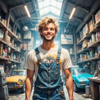 The image features a man standing in an industrial setting. He appears to be smiling and looking slightly upwards, perhaps towards the camera or at someone not visible in the frame. He is dressed in overalls that are visibly worn, suggesting he might have been working with tools or machinery. In the background, there are several shelves stocked with various items that could be related to automotive or industrial work. There is a yellow sign on one of the shelves that reads "God", but it's not clear what context this might have in this particular setting. The presence of cars suggests that this location may be an auto repair shop or similar environment.
