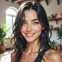 In the image, there is a young woman with long brown hair. She has an open and radiant smile on her face. Her eyes are a light color, possibly hazel or green, which contributes to her cheerful expression. The woman appears to be in a room that seems like it could be part of a wellness retreat or spa, as there is natural light coming from the windows behind her and plants are visible in the background. She's wearing a black top with a scoop neckline. The overall atmosphere of the image is warm and inviting.