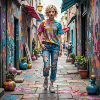 На картинке изображена женщина, идущая по узкой, ярко расписанной улочке или переулку. У нее короткие светлые волосы, и она одета в красочную футболку с тай-дай принтом и потертые джинсы. Выражение ее лица нейтральное, она смотрит вперед. Вокруг нее – горшки с растениями, таблички с нечитаемым текстом и, похоже, декоративные сферы разных цветов, выстроенные вдоль переулка. Архитектура указывает на городскую застройку с узкими улочками, характерными для некоторых старых европейских городов.