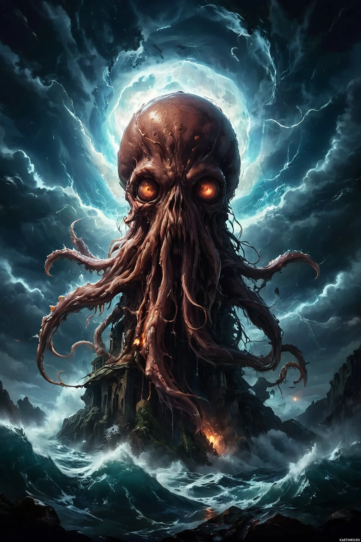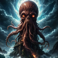red eyes at its center, which is often associated with horror motifs. Surrounding the skull are tentacles, reminiscent of an octopus, extending outward from the bottom right corner of the skull. The background has a tumultuous sky with