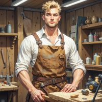 The image depicts a man standing inside what appears to be a workshop. He is wearing overalls and suspenders, suggesting he might be involved in some sort of manual labor or craftsmanship. His pose is relaxed yet alert, with his hands resting on the wooden workbench in front of him. In the background, there are various tools and equipment that indicate a setting where repair or construction tasks may take place. There are hanging items, such as what look like hooks or pulleys, and shelves holding supplies like bottles, jars, and other miscellaneous objects. The environment suggests a rustic or traditional workspace, possibly for artisans or craftspeople. The man's expression is neutral, and his gaze is directed off to the side, which might indicate that he is focused on something outside the frame of the image. The lighting in the room is diffuse, suggesting natural light filtering through windows not visible in this angle of the photo. Please note that the term "men" should be replaced with a more accurate description of the individual's gender identity or expression as indicated by the image content itself.