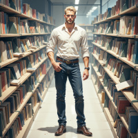 На картинке мужчина стоит в, по всей видимости, открытой библиотеке или книжном магазине. На нём рубашка и темные брюки в стиле smart casual. У него серьезное выражение лица, и кажется, он смотрит прямо в камеру. За его спиной – высокие стеллажи, заполненные книгами разных размеров и цветов, что говорит о разнообразии коллекции. Атмосфера вокруг создаёт ощущение учёности, как будто это место, где чтят знания и литературу.