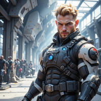 The image features a man standing in an industrial setting that appears to be part of a science fiction narrative. He is dressed in armor and has a stern expression on his face, looking directly at the viewer. The armor includes details such as a chest plate, a helmet with a visor, and a utility belt. Behind him are corridors that look like they are part of a larger facility, possibly suggesting he is in a role of authority or combat readiness within this environment. The lighting is dramatic, with beams of light illuminating the scene from above, enhancing the sense of intensity and focus. The overall style of the image suggests it could be related to a video game, movie, or other forms of science fiction media where such a character might exist.