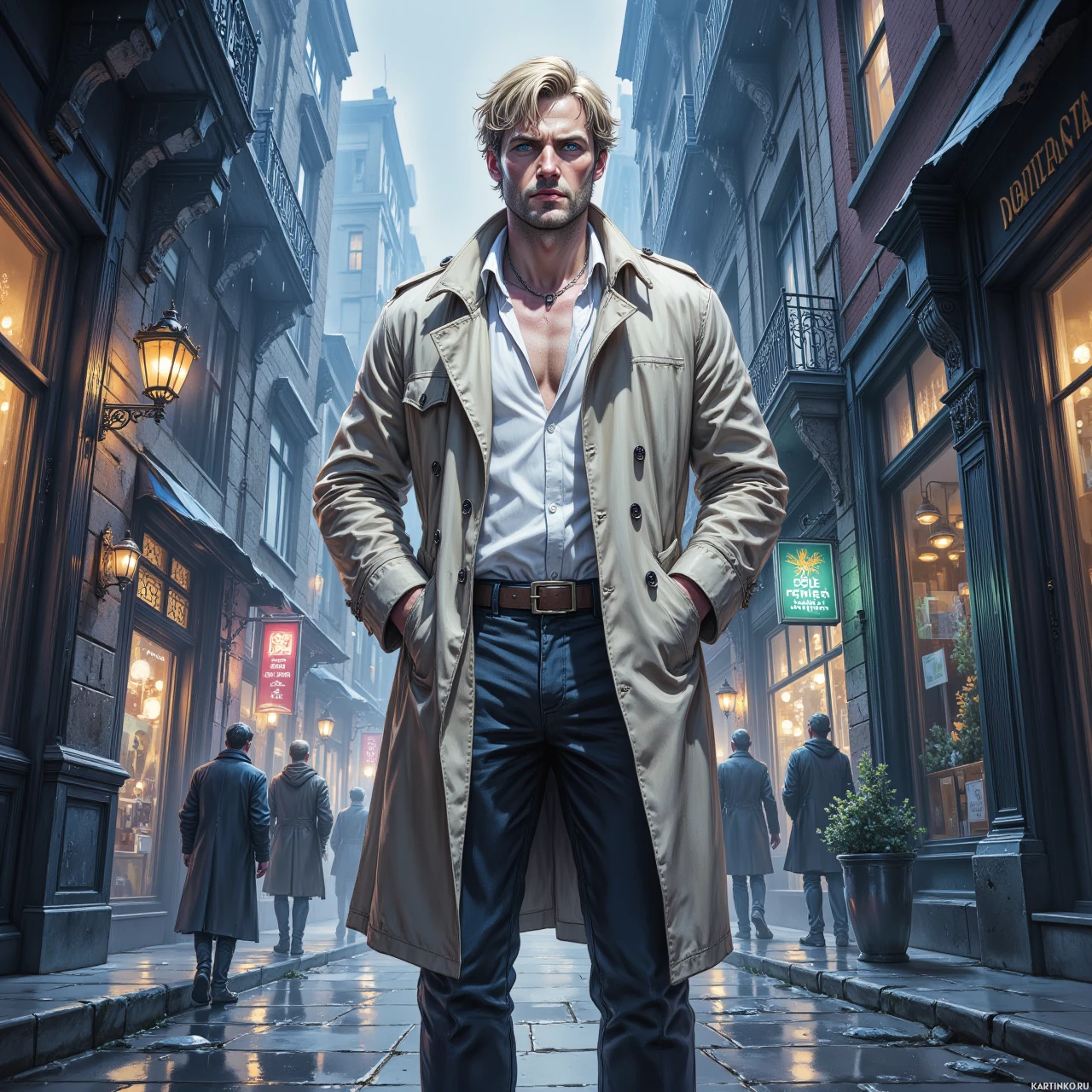 На картинке изображен персонаж, стоящий в том, что похоже на переулок или узкую улицу. На нём плащ и брюки, создающие образ классического детектива. Выражение его лица серьезное, руки засунуты в карманы пальто. На заднем плане видны другие люди, которые, кажется, смотрят вниз, что создает ощущение тайны или беспокойства по поводу того, что находится за кадром. Обстановка указывает на сцену из исторической драмы или нуарной истории, благодаря одежде и атмосферному освещению, создающему ощущение сырости и дождя, характерные для таких сюжетов.