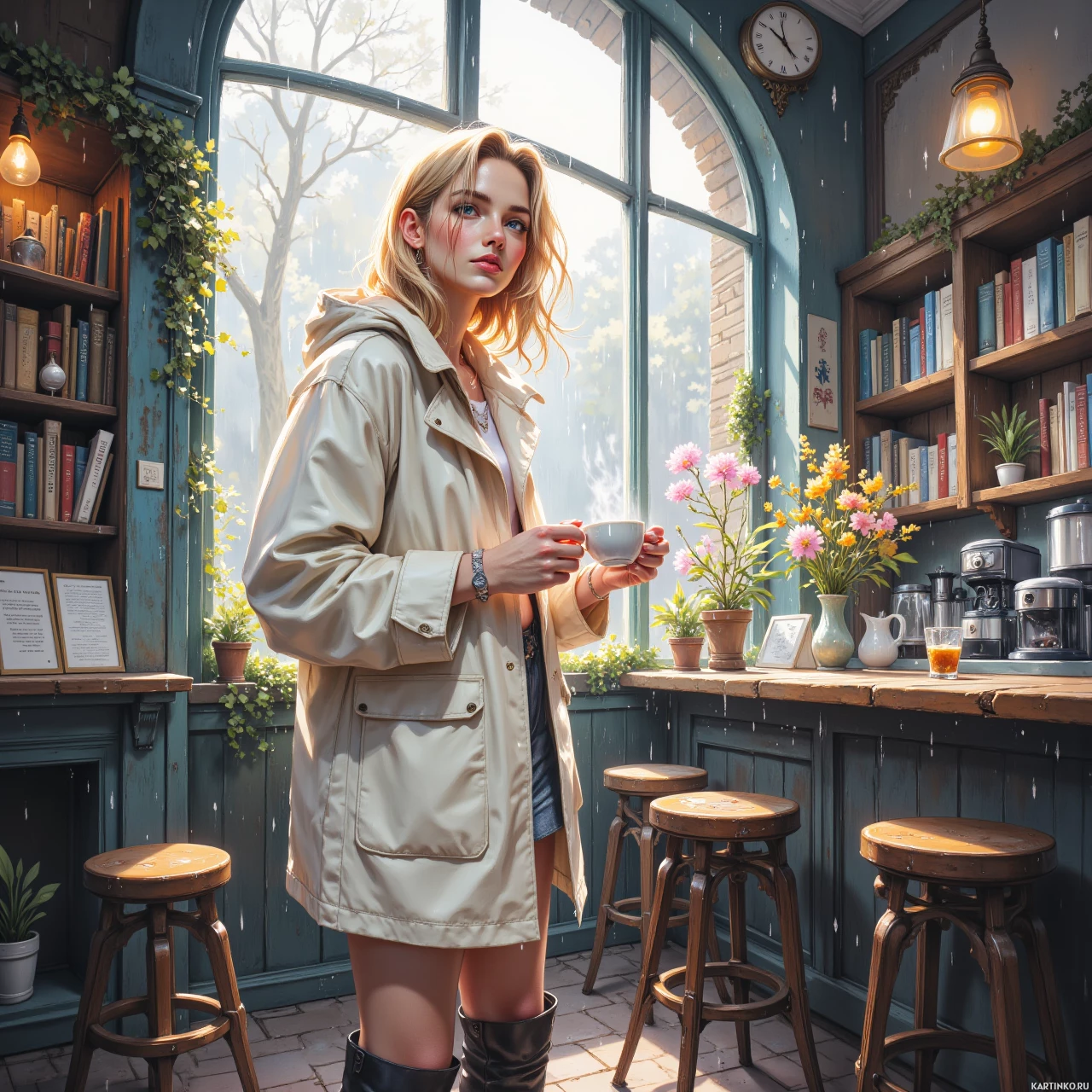 На картинке изображена рыжеволосая девушка со светлой кожей и ясными голубыми глазами. На ней топ бежевого цвета с длинными рукавами и цветочным узором на талии. Её волосы уложены в свободные локоны, обрамляющие плечи. Выражение лица нейтральное, она смотрит прямо перед собой, слегка в сторону. Задний план – открытое пространство, залитое дневным светом, с вьющимися растениями, оплетающими арочные каменные конструкции, похожие на ворота или туннель.