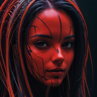 a black base, adorned with cracks and splatters of the same red and black colors, giving it a damaged or superhero-inspired look. The image is highly detailed and seems to be a piece of digital artwork that showcases a creative fusion of realistic human features with fantastical elements, evoking