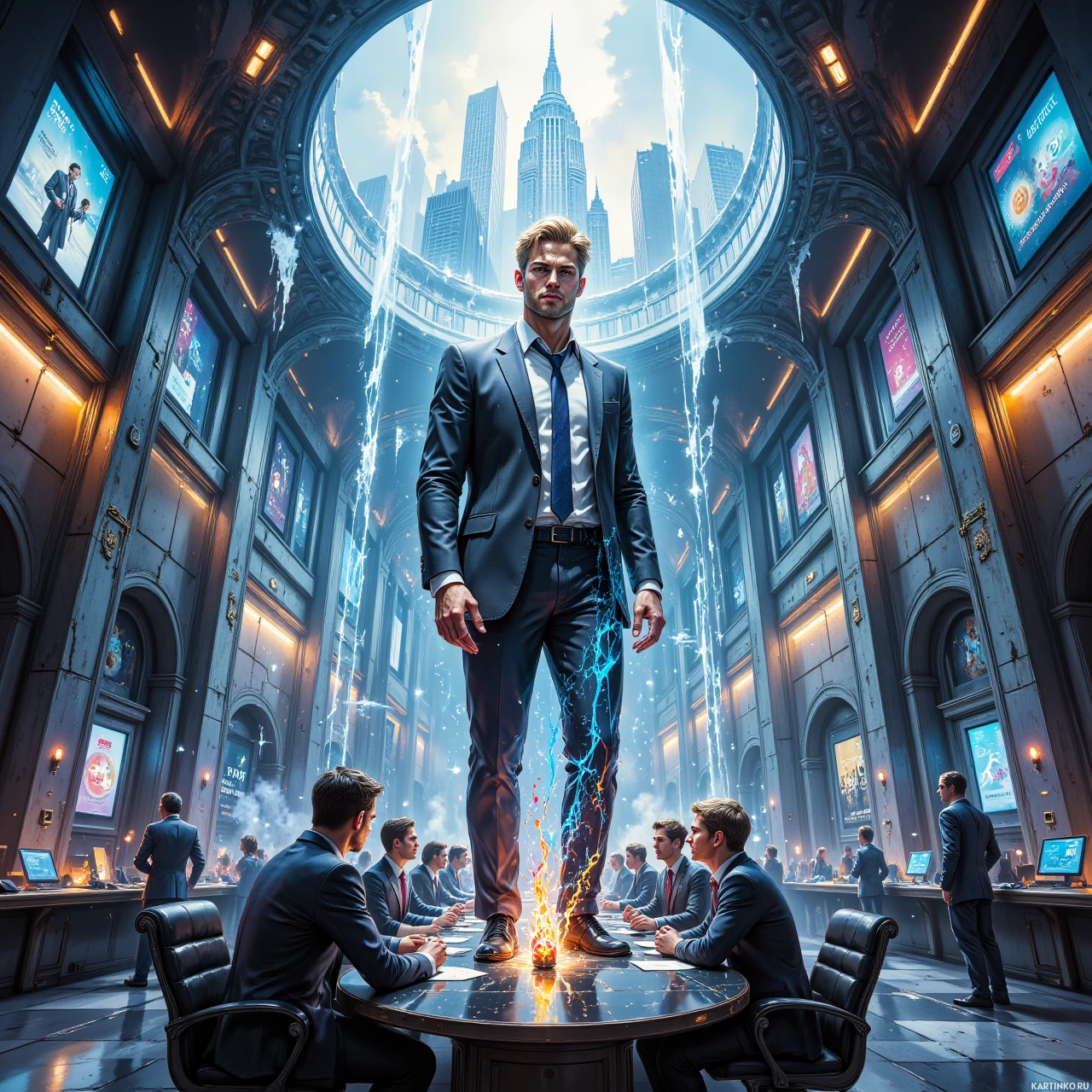 Картинка изображает футуристическую сцену, в центре которой стоит мужчина, держащий молнию. На нём тёмный костюм и галстук, руки широко расставлены, словно он принимает вызов или власть. Вокруг него несколько других людей, поглощённых работой за экранами или за столами. Окружающая обстановка указывает на высокотехнологичную среду с цифровыми дисплеями и передовыми технологиями повсюду.