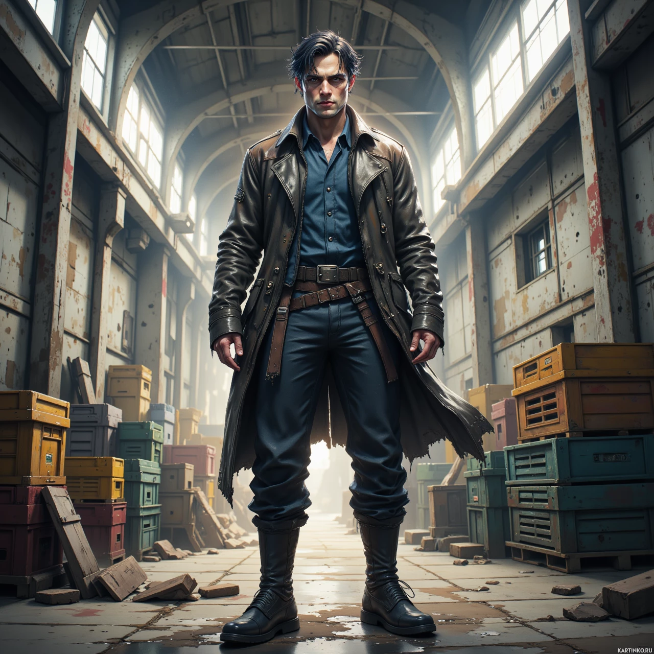На картинке изображен мужчина, стоящий в индустриальном помещении, похожем на склад. На нём одежду, напоминающую костюм классического авантюриста или детектива: длинный плащ, жилет и брюки, отсылающие к определенной эпохе. Его волосы аккуратно уложены, на лице серьезное выражение. На заднем плане видны массивные металлические конструкции, детали машин и ящики, создающие атмосферу склада. Освещение промышленное, от подвесных светильников падают тени, придавая сцене слегка мрачную атмосферу.