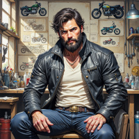 The image depicts a character who appears to be a man with a muscular build and a well-groomed beard. He is seated in what looks like a garage or workshop setting, surrounded by various motorcycle-related items. There are illustrations of motorcycles hanging on the wall behind him, suggesting that this might be a specialized space for repairing or customizing motorbikes. The character is wearing a leather jacket and blue jeans, with a belt visible around his waist. He has dark hair and is looking off to the side with a serious expression on his face. The lighting in the image indicates that it could be daytime due to natural light coming through a window or another opening. The overall style of the image, which includes the character's detailed appearance and the detailed background elements, suggests that this might be from a graphic novel or an illustrated book, where such characters are commonplace.