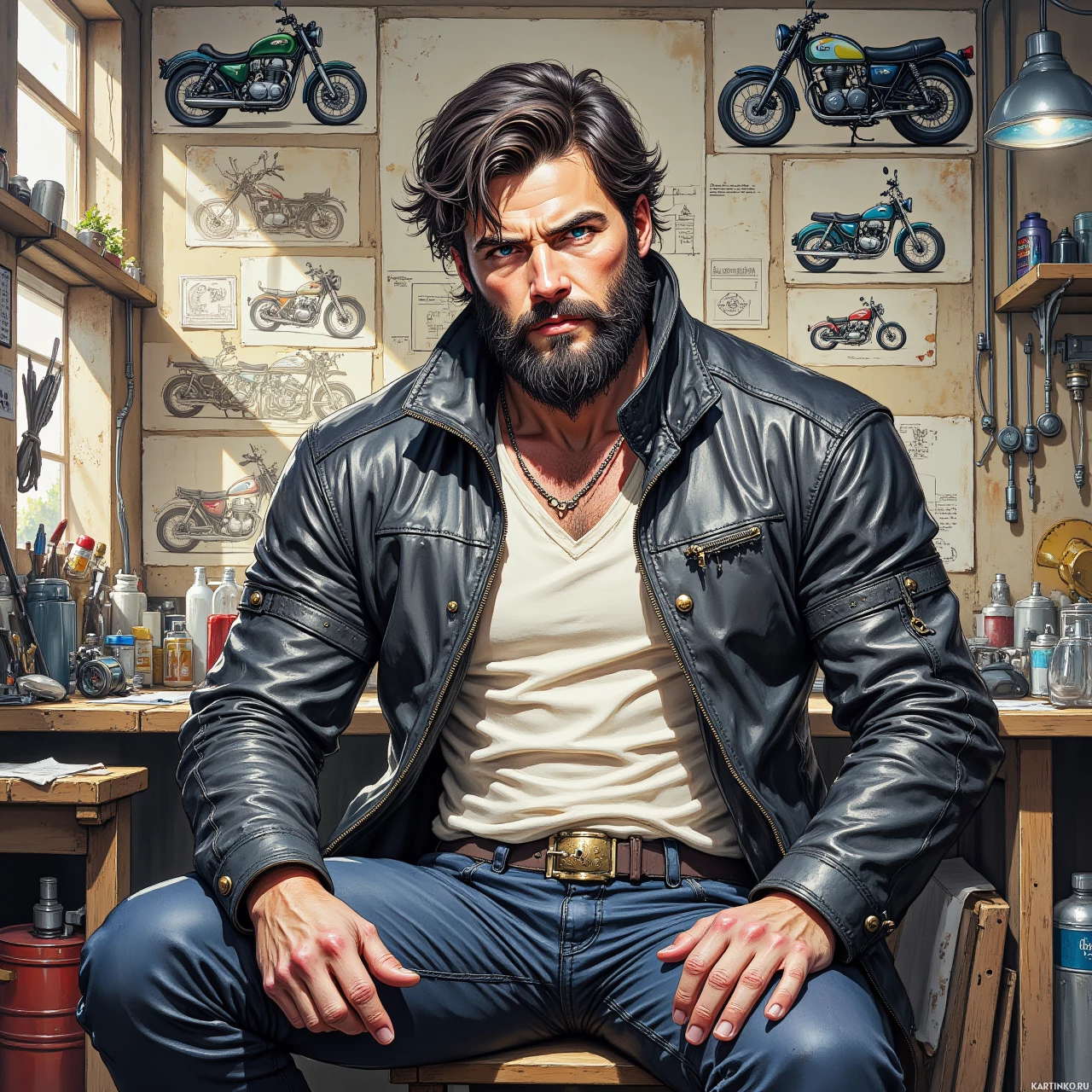 На картинке изображен персонаж, похожий на мужчину с мускулистой фигурой и ухоженной бородой. Он сидит в том, что выглядит как гараж или мастерская, окруженный различными предметами, связанными с мотоциклами. На стене позади него висят рисунки мотоциклов, что говорит о том, что это, возможно, специализированное место для ремонта или тюнинга мотобайков. Персонаж одет в кожаную куртку и джинсы, виден пояс на талии. У него темные волосы, и он смотрит в сторону с серьезным выражением лица. Освещение на картинке говорит о том, что это день, благодаря естественному свету, проникающему через окно или другое отверстие. Общий стиль картинки, включая детальную внешность персонажа и проработанные элементы фона, предполагает, что она может быть из графического романа или иллюстрированной книги, где такие персонажи – обычное дело.