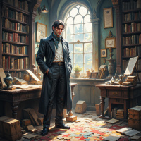 На картинке мужчина стоит в старинной книжной лавке. На нём тёмный плащ и белая рубашка с воротником, отделанным чёрными лацканами. Комната заполнена книгами и различными предметами: глобусами, научными инструментами, а также, кажется, картами и бумагами, разбросанными на полу. На стенах висят картины, а окна скрыты шторами, через которые проникает естественный свет. Он стоит в центре комнаты, руки в карманах, смотрит в сторону с задумчивым выражением лица. Общая атмосфера картинки передаёт сцену из исторического или фантастического сеттинга.