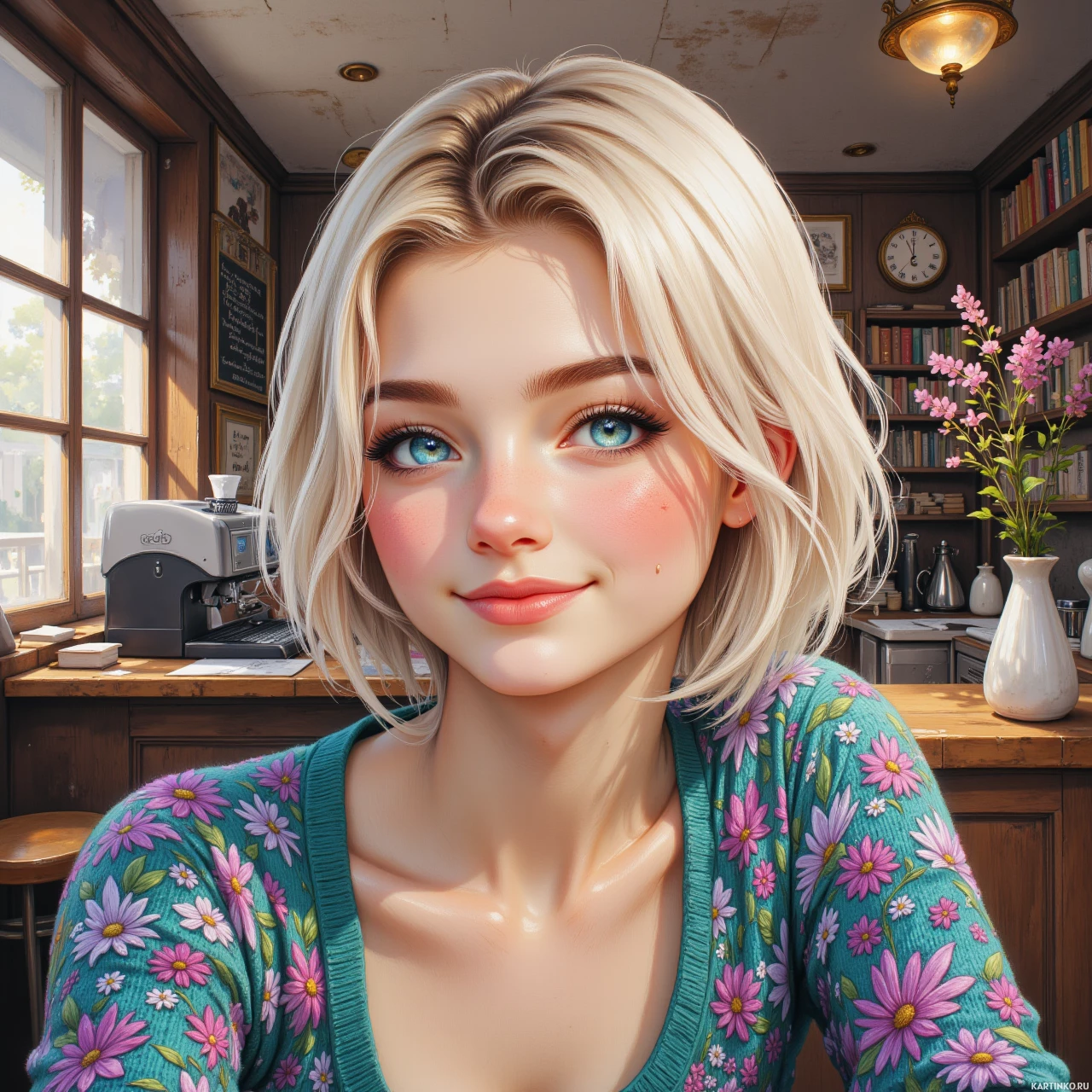 На картинке молодая женщина с светлыми волосами. У неё большие голубые глаза и румяные щёчки, придающие ей наивный и юный вид. Волосы короткие и прямые, с лёгкой волной на концах. На лице макияж: подчёркнутые брови и помада в тон кожи. У неё светлый оттенок кожи, и она смотрит прямо в камеру с лёгкой улыбкой на губах. Глаза искрятся озорством. Она сидит в помещении, вероятно, в кафе или кофейне, как подсказывает деревянная барная стойка справа, на которой стоят чашки, книги и вазы с цветами. Общая атмосфера картинки создаёт ощущение непринуждённости и расслабленности.