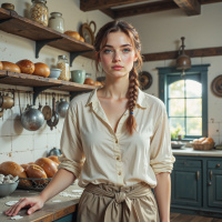 На картинке женщина стоит в пекарне. У неё руки опираются на, кажется, деревянную столешницу. У неё длинные волосы, заплетённые в косу, она одета в светлую рубашку с воротником, коричневый фартук и, похоже, бежевые брюки. На заднем плане видны элементы пекарни: полки, заполненные различными продуктами – ингредиентами или выпечкой. На стене за ней висит часы. У женщины на лице нейтральное выражение, и она смотрит прямо в камеру.