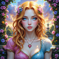 The image features a young woman with long, wavy blonde hair and striking blue eyes. She has rosy cheeks and is wearing light makeup that accentuates her features. Her lips are slightly parted in a relaxed expression. She has a small heart-shaped necklace around her neck. She is dressed in what appears to be traditional or fantasy attire, with a pink garment underneath and a blue bodice over it. A golden collar adorns her neck, suggesting a sense of refinement or nobility in her character. The background is an idyllic pastoral scene with blooming flowers and lush greenery, including trees and bushes. The colors are vibrant, with pinks, blues, and greens dominating the view, creating a serene and peaceful atmosphere. There's a clear sky above, indicating good weather conditions. The overall style of the image is reminiscent of fairy tales or fantasy artwork, characterized by its vivid colors, detailed background, and the ethereal beauty of the subject.