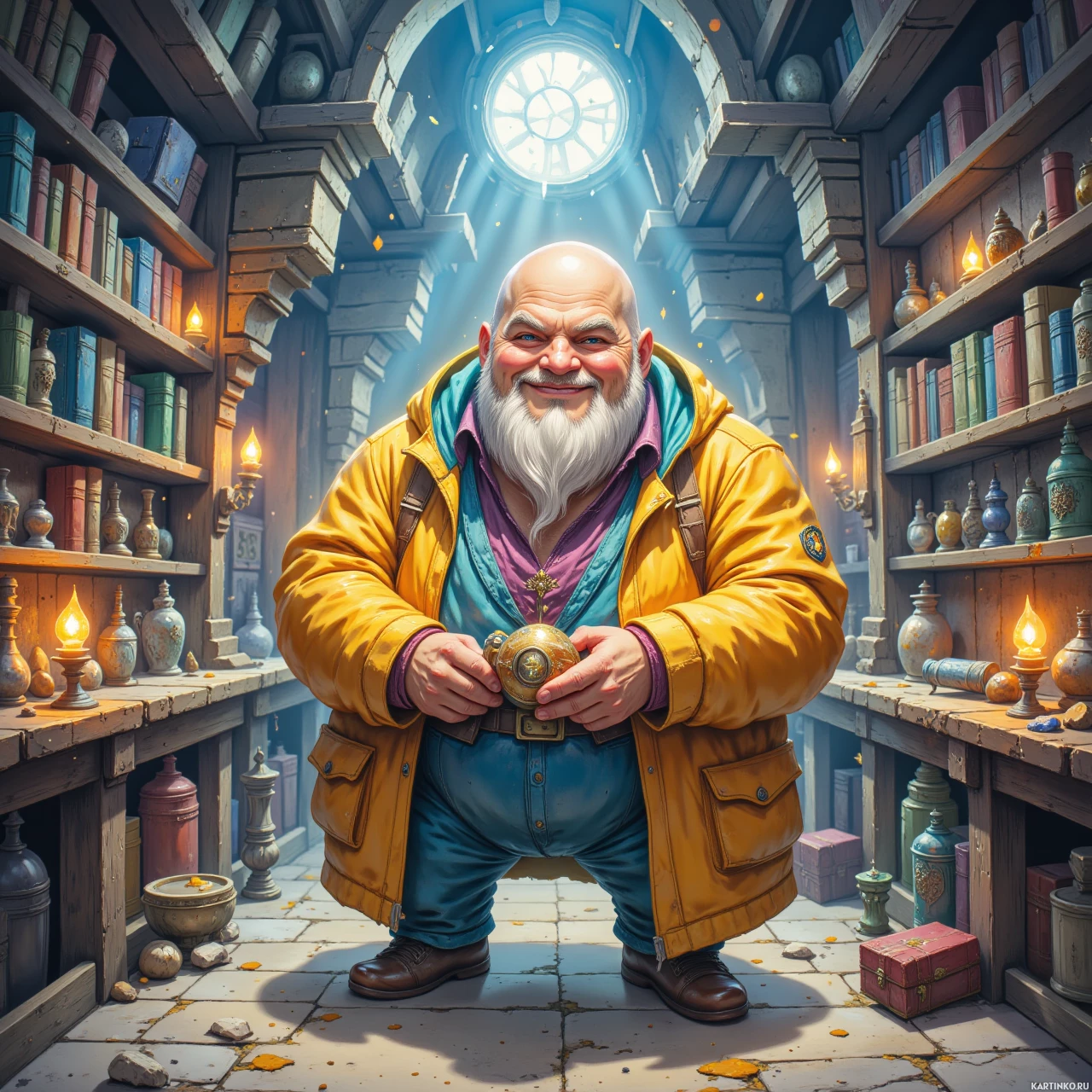 На картинке изображен мультяшный персонаж, похоже, мужчина средних лет с белой бородой. На нем теплая, красочная куртка, а на лице – широкая улыбка, передающая ощущение счастья или восторга. За его спиной – полки, заставленные книгами от пола до потолка. Кажется, это уютная комната, возможно, кабинет или библиотека, с теплой и располагающей атмосферой. В руке персонаж держит небольшую фигурку или статуэтку. Общий стиль картинки – мультяшный и сказочный, что указывает на сцену из мультфильма или анимационного фильма.