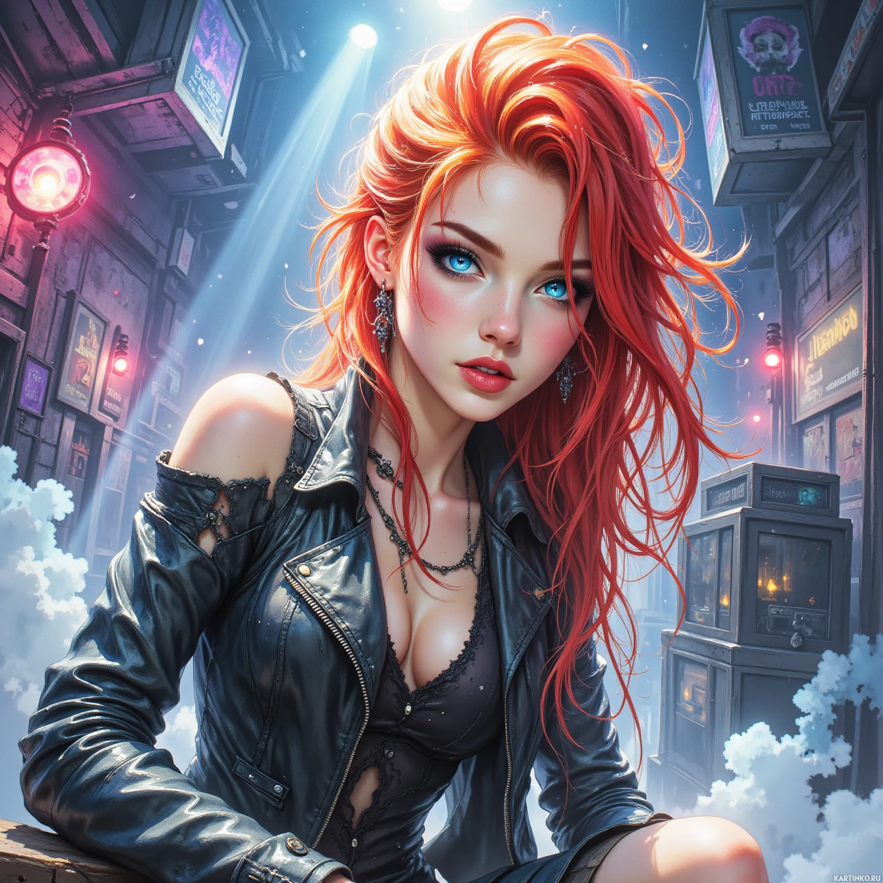 The image depicts a digital artwork of a female character with vibrant red hair. She has large blue eyes and is wearing black attire that includes a jacket and gloves, suggesting she might be in a setting that requires such clothing, possibly for protection or fashion purposes. Her posture is relaxed, as if she is sitting comfortably, and her gaze seems directed off to the side with an expression that could be interpreted as contemplative or focused. The background has an urban feel, with various neon lights and signs that are reminiscent of a bustling cityscape at night.