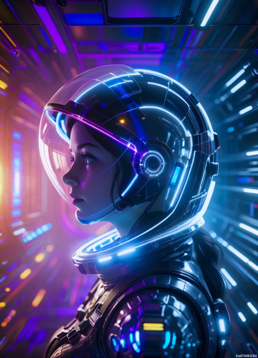 advanced technology. Her expression is focused as she looks towards the viewer, implying concentration or preparation for a mission. The background contains intricate details of machinery and a vibrant