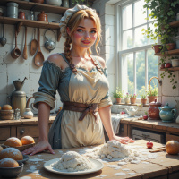 На картинке молодая женщина, похоже, готовит еду на деревенской кухне. У неё светлые волосы, заплетённые в косы, и она одета в традиционный фартук поверх длиннорукавной кофты. Фартук предполагает, что она может заниматься выпечкой или приготовлением пищи. На её лице – радостное выражение, лёгкая улыбка, и она смотрит в камеру. Кухня вокруг неё хорошо оборудована для выпечки и готовки, с деревянными шкафчиками и полками, заполненными различными кухонными принадлежностями и ингредиентами. На полках — банки и бутылки, возможно, с приправами или другими кулинарными продуктами. На столе — миска с тестом, что говорит о том, что она, возможно, делает выпечку или хлеб. В целом, сцена изображает приятный момент домашней жизни, когда женщина с удовольствием проводит время на кухне. На картинке нет никаких текстовых элементов.
