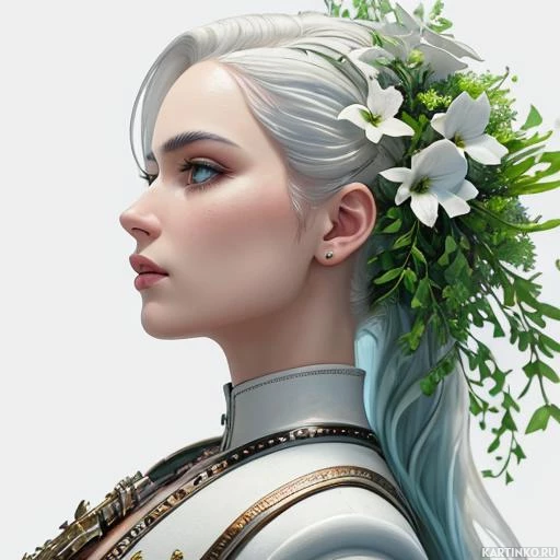 white hair styled in long braids and adorned with what appears to be a floral crown or wreath. The character has