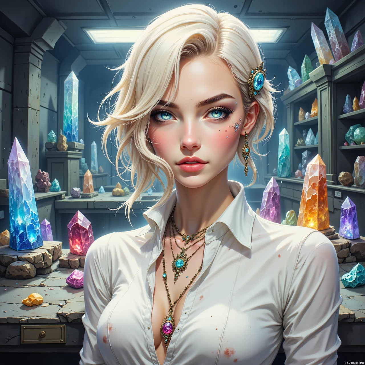 На картинке изображена девушка с белыми волосами. У нее поразительные голубые глаза, и она носит украшения, среди которых, кажется, серьга на одном ухе. Макияж выполнен безупречно, подчеркивая черты лица тонкими штрихами цвета. Место действия предполагает, что она находится в комнате, полной кристаллов, или, возможно, в лаборатории, ведь вокруг множество бутылок и контейнеров. На заднем плане – полка с кристаллами. На правой руке у нее также браслет. Общая атмосфера картинки весьма сказочная и мистическая, что соответствует тематическим элементам в комнате.