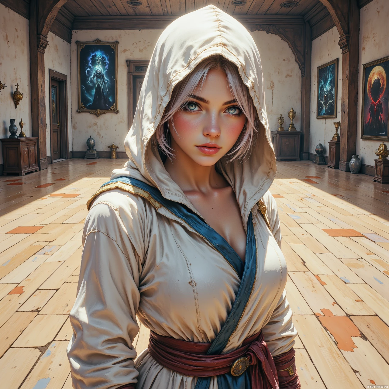 Картинка демонстрирует компьютерную визуализацию женского персонажа. У неё белые волосы и светлая кожа, она одета в бежевую тунику с капюшоном. Выражение лица нейтральное, взгляд направлен прямо перед собой. На заднем плане – разнообразные произведения искусства, изображающие фэнтезийные мотивы: драконов и магические предметы. Кажется, действие происходит в комнате с антикварной мебелью, что соответствует исторической или фэнтезийной тематике, перекликающейся с нарядом персонажа.