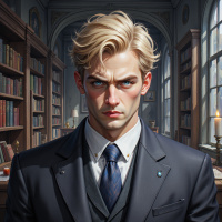 The image features a male character with blonde hair and striking blue eyes. He is wearing a formal attire consisting of a suit, coat, vest, and tie, along with what appears to be a medal or insignia on his lapel. His expression is serious, and he is looking directly at the viewer. The background suggests an indoor setting with bookshelves filled with books and candles, which gives off an ambiance of sophistication or academia.