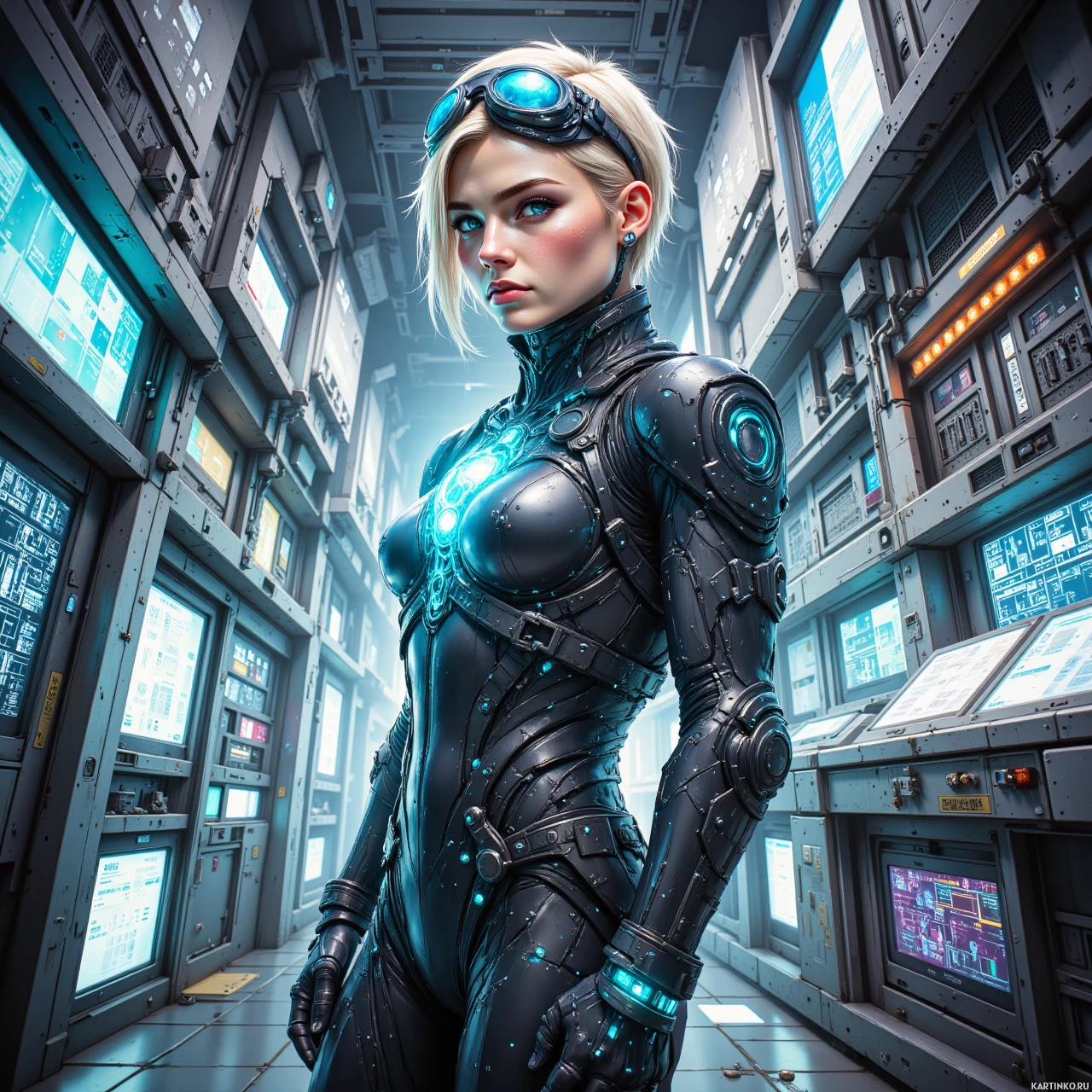 На картинке изображена девушка в футуристических доспехах с высокотехнологичным дизайном. У неё короткие белые волосы, и она смотрит прямо на зрителя. На заднем плане – сложный, замысловатый набор цифровых панелей, создающих ощущение передовых технологий или сложного механизма. Внешний вид девушки и окружающая обстановка указывают на научно-фантастический сеттинг.