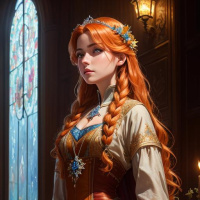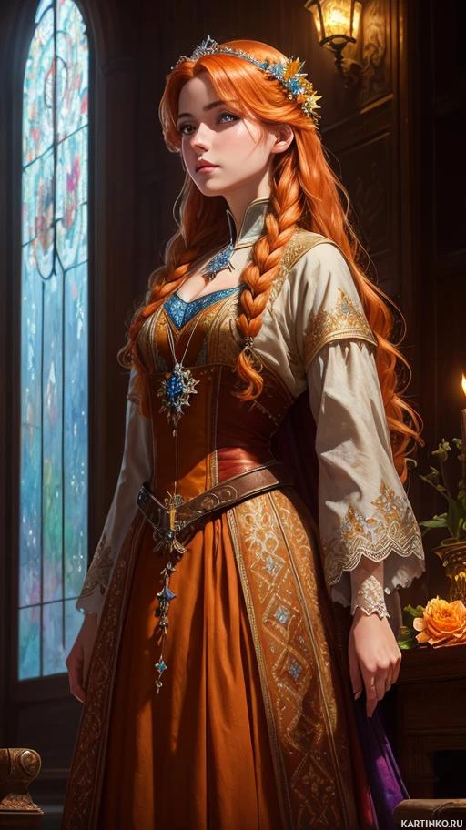 a neutral expression, and is standing in front of a large window that suggests a setting in a well-lit room with an old-fashioned interior design. The overall style of the image is reminiscent of high fantasy artwork commonly found in