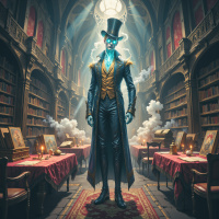 The image depicts a character in what appears to be a fantasy setting. The individual is wearing an elaborate costume that includes a top hat and is draped in a long coat with intricate designs on the sleeves. The attire has a dark color scheme, contrasting with their pale complexion. They are holding a cane in one hand. The character stands in what looks like an ornate room, possibly a library or study given the presence of numerous books and scrolls on shelves and tables around them. The room is dimly lit by candles, which adds to the mystical atmosphere of the setting. There are also faint wisps of smoke near the ceiling, contributing to the sense of a dramatic or mysterious environment. The character's pose suggests confidence, with one hand resting on their hip and the other holding up part of the coat. The overall impression is that this is a scene from a fantasy-themed video game, movie, or book illustration, where the character might be portrayed as a scholar, magician, or some sort of powerful figure within the narrative context.